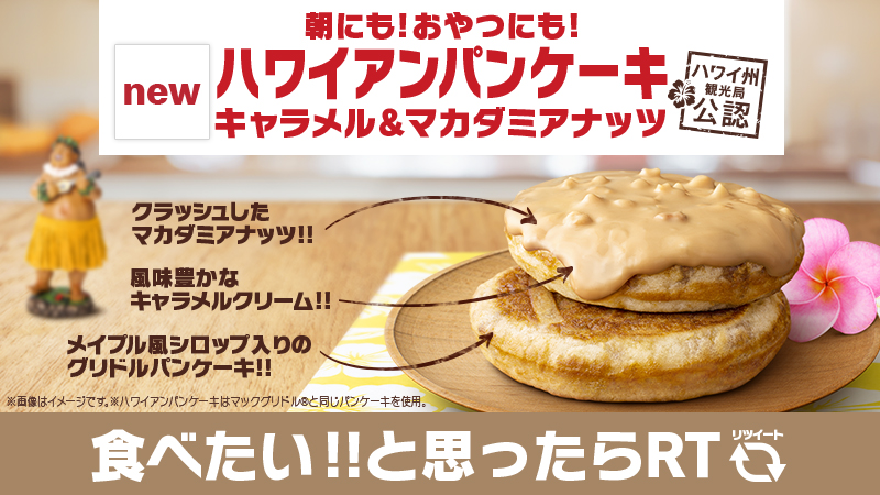 マクドナルド On Twitter 朝にも おやつにも 新登場の ハワイアンパンケーキ メイプル風シロップ入りのパンケーキ にキャラメルクリームがかかって最高においしい クラッシュしたマカダミアナッツも 朝マックから楽しめます 食べたいと思ったらrt